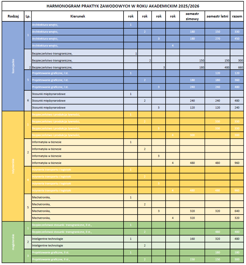 Harmonogram praktyk – rok akademicki 2025/2026